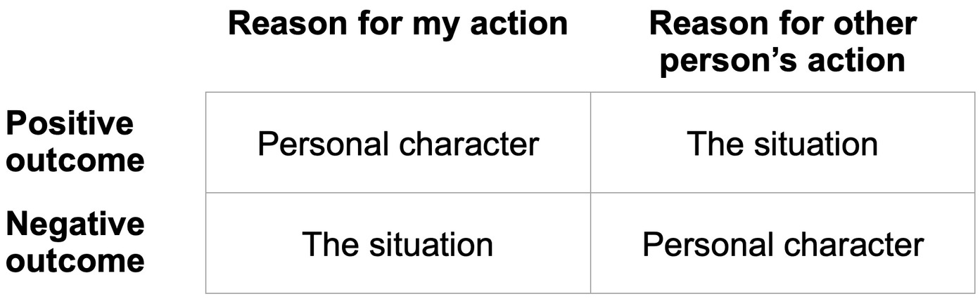 Or the inverse — we attribute our own positive outcomes to our own character, and others’ positive outcomes to situation. I arrived on time to work because I take my job seriously. He arrived on time because it’s his job.