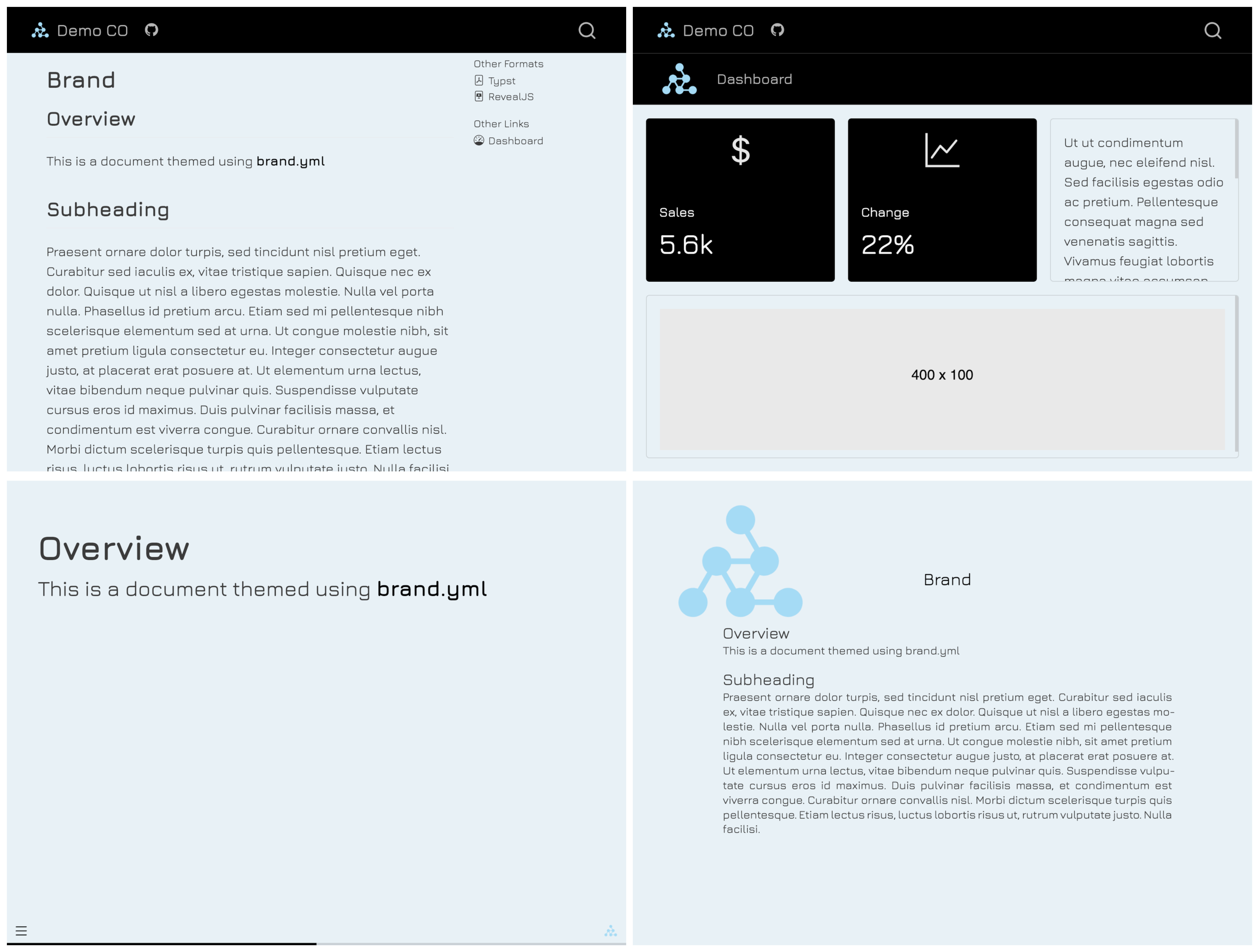 brand.yml a single YAML file that can be used to customize the appearance of your documents across multiple formats. And Quarto supports it, meaning that you can write one single brand.yml file, and your outputs across things like websites, dashboards, presentations, and PDFs will have a similar look and feel.