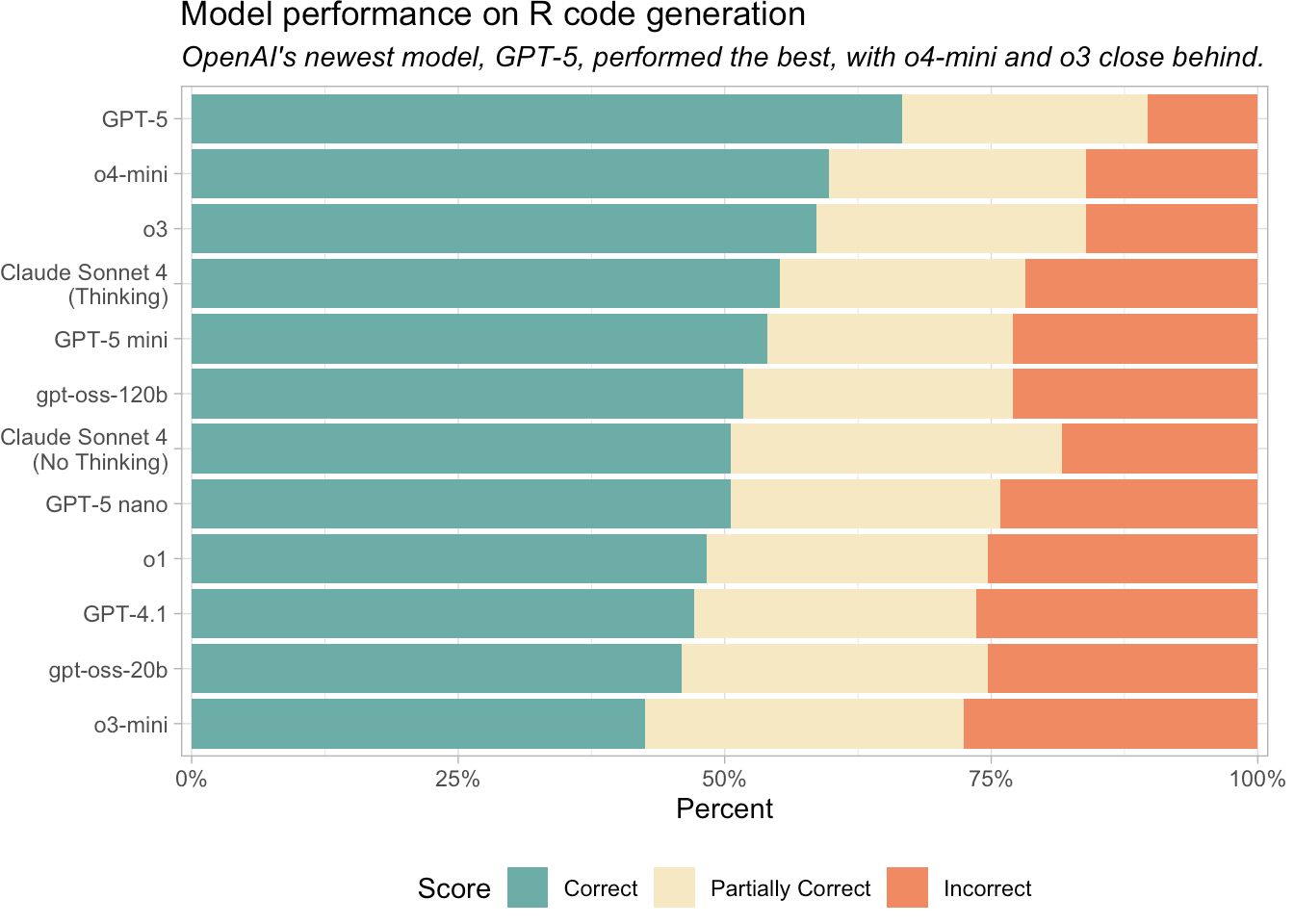 I haven’t used either agent enough to know their failure modes, and which might be better in certain circumstances. As of last week, GPT-5 seems to outperform Claude for writing R code, and Codex uses GPT-5 under the hood.