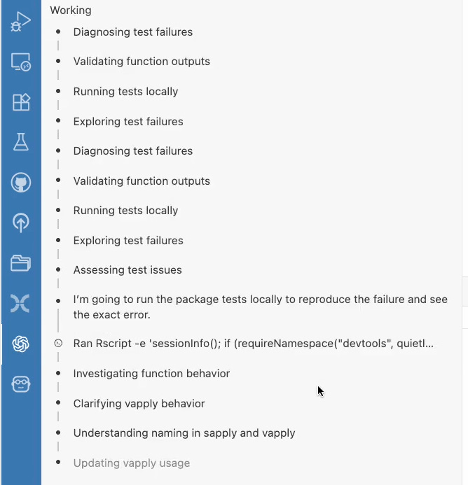 Another factor might be cost. Instead of using API credits, Codex uses your existing ChatGPT Plus, Team, Pro, Edu, or Enterprise subscription. In my post on Positron Assistant I showed that the entire package development experiment (admittedly simple) cost about $0.09 cents. But if you’re relying on this daily and using it for heavier tasks, you might run up a decent bill. If you’re already paying $20/month for ChatGPT Plus, using Codex doesn’t cost you any more.
