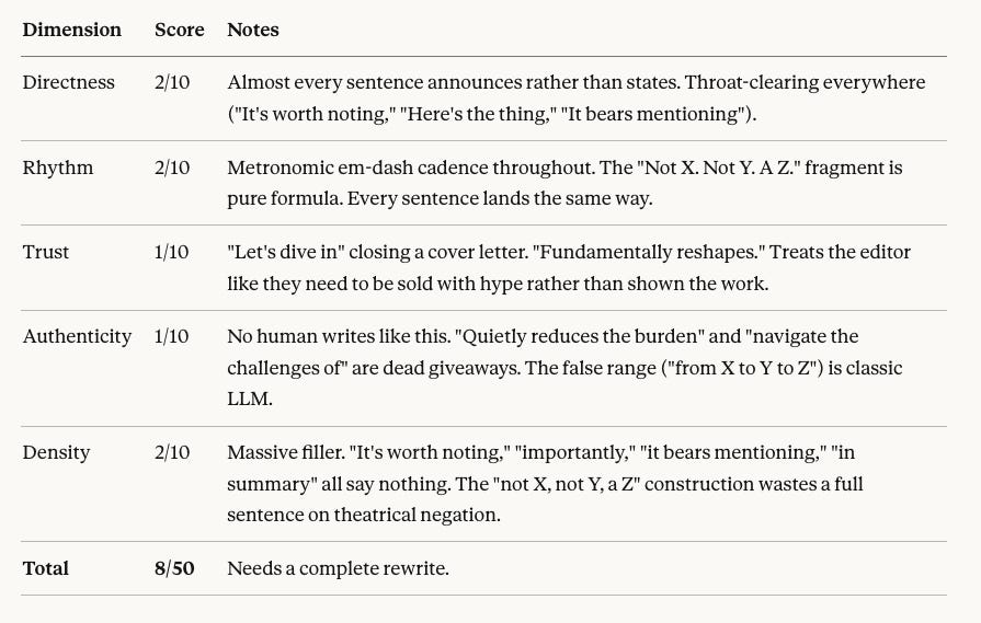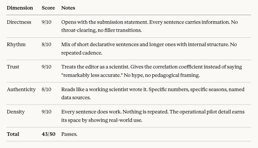 As a demo, I had Claude write a cover letter for a paper that I’ve already published (Nagraj et al. 2025, PLOS ONE, blog post here), as if I’m submitting it to PLOS ONE, with every AI trope cranked up. It scored 8/50. Then I ran the deslop skill on the same content. The rewrite scored 43/50. Specific numbers replaced vague claims, filler transitions disappeared, and it read like a person wrote it for a purpose rather than a model producing plausible cover-letter-shaped text.