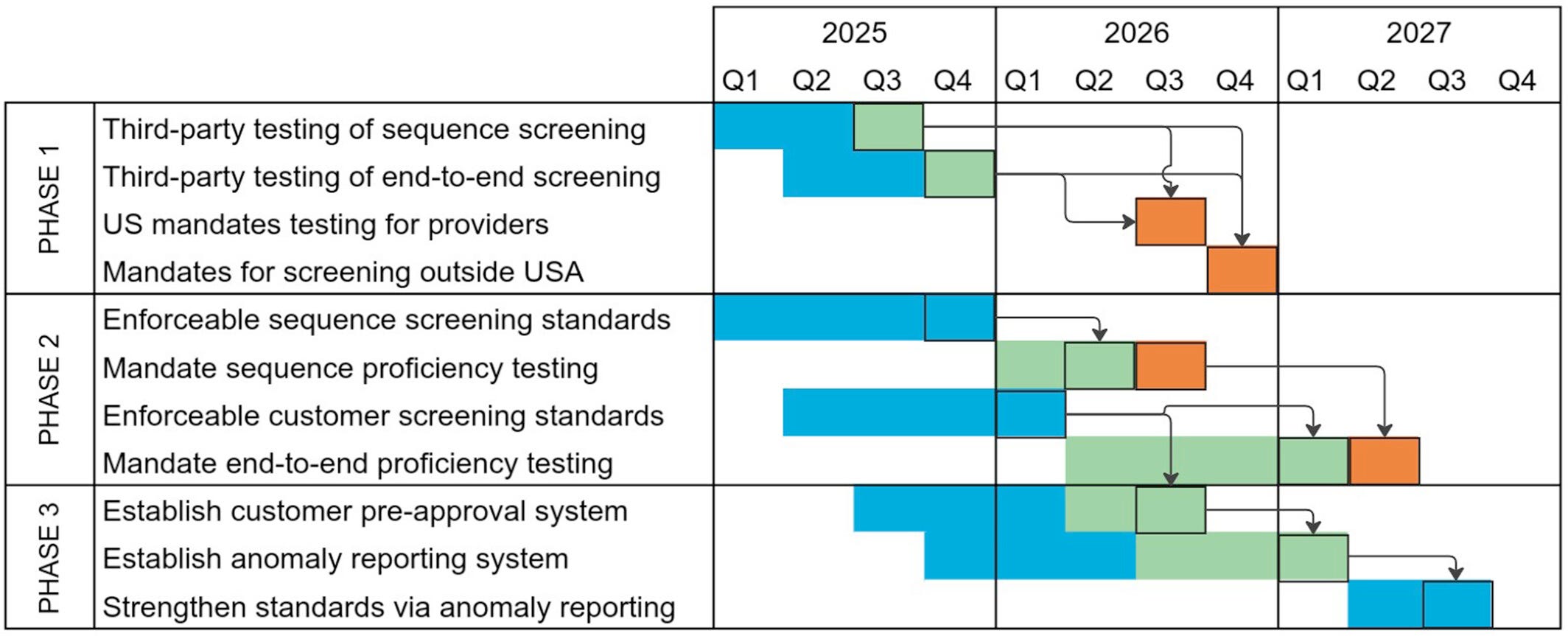 The paper outlines an ambitious three-phase roadmap for the United States, leveraging the May 2025 Executive Order on biological research safety.2 Phase 1 focuses on verifying minimal compliance, i.e. essentially proving that screening systems exist and function at a basic level. Phase 2 strengthens these requirements to ensure actual biosecurity effectiveness, incorporating comprehensive standards for both sequence and customer screening. Phase 3 aims for continuous improvement, including customer preapproval systems and anomaly reporting mechanisms similar to those used in aviation safety.