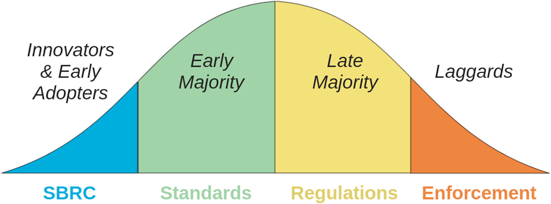 Once the early majority has voluntarily adopted standards, it de-risks enforceable regulation from the government, and indeed the early adopters and early majority become incentivised to support enforceable regulation, as it now becomes a competitive advantage for them and a disadvantage for their competitors who have been neglecting biosecurity.