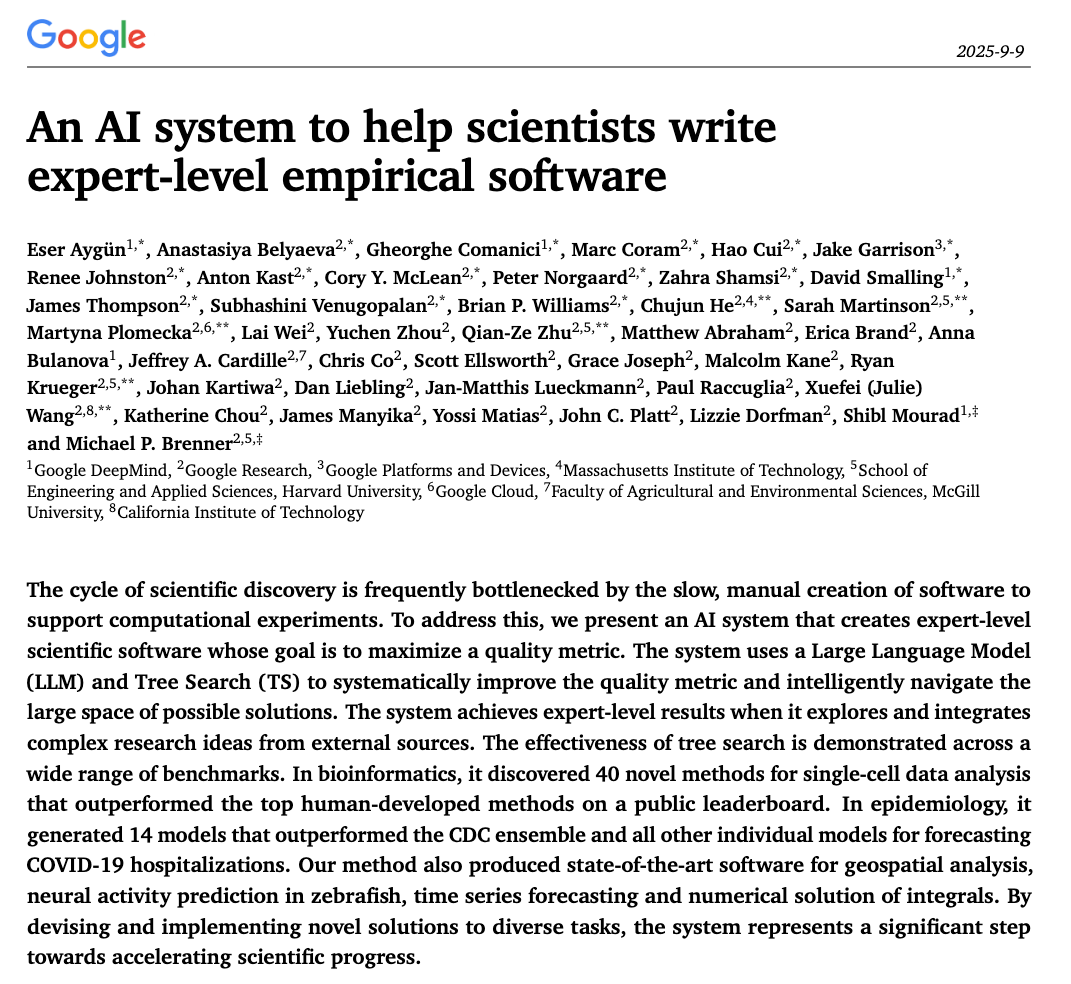 Aygün et al. “An AI System to Help Scientists Write Expert-Level Empirical Software.” arXiv (2025) doi: 10.48550/arXiv.2509.06503.