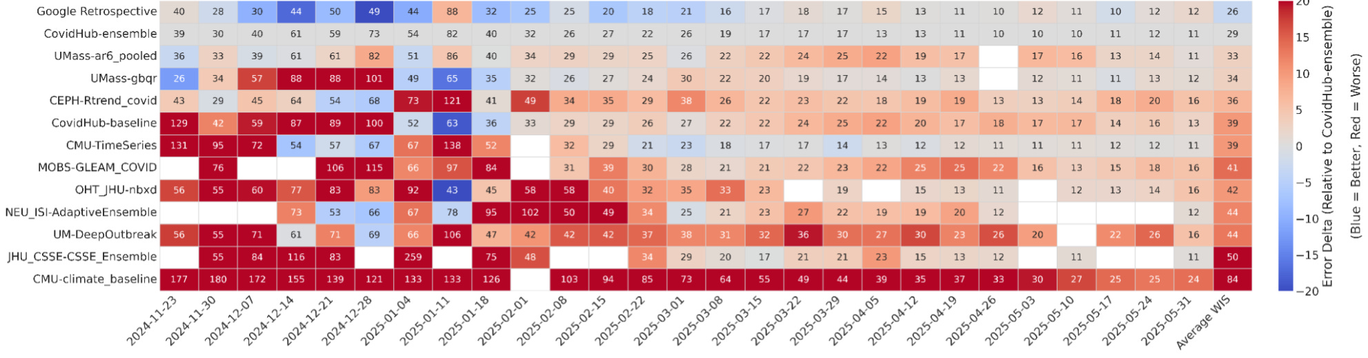 Here, I’m more reserved. Retrospective performance is not the same as live forecasting, and anyone who worked on COVID-19, influenza, RSV, West Nile virus, or other infectious disease forecasts has seen that models that looked strong historically failed in real time (you’re often dealing with inconsistent reporting that gets backfilled or corrected after the fact, imputing values for states/locales that didn’t report that week, and many other issues). That said, beating the ensemble in retrospective testing across multiple horizons and jurisdictions is not trivial, and if these results hold up in prospective settings, I believe it would represent a genuine step forward.
