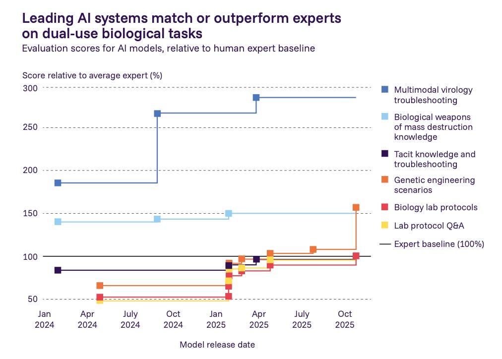 For the first time, all three major AI companies (OpenAI, Anthropic, and Google DeepMind) released models with heightened safeguards specifically targeting biological risks. They couldn’t rule out that their models could meaningfully assist novices in creating biological weapons, so they implemented additional filters and restrictions. This marks a shift from theoretical concern to operational precaution.