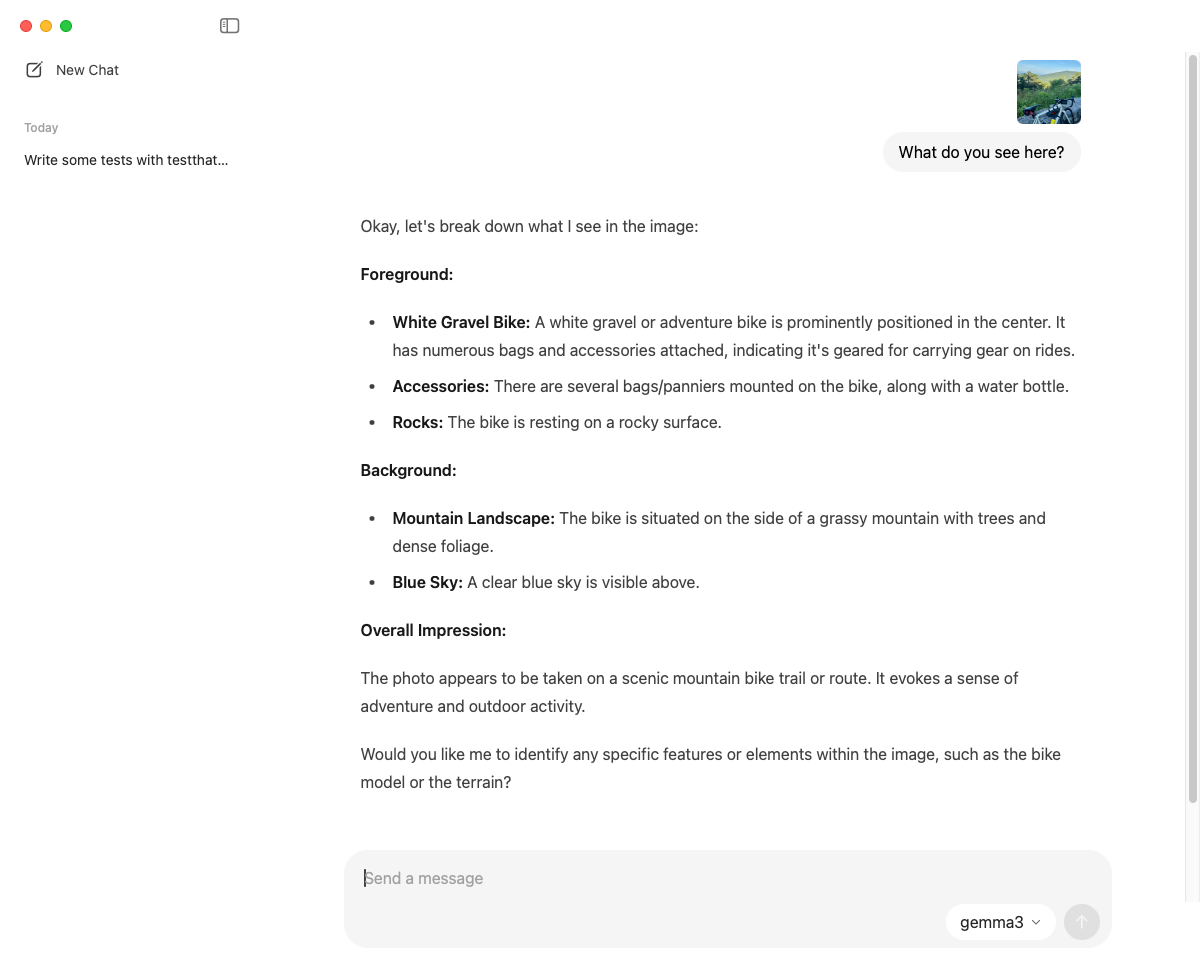 Gemma3 is a vision model, so we should be able to upload an image and ask about it. I uploaded this photo I took yesterday on a bike ride through Shenandoah National Park, and asked Gemma3 to summarize the image.
