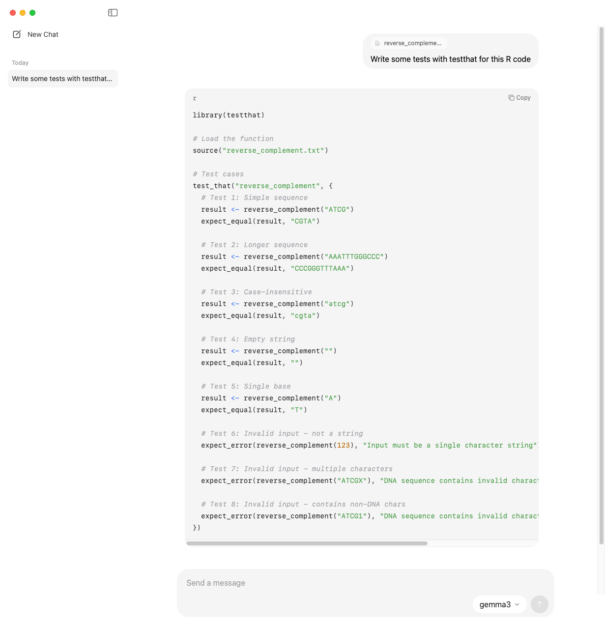 You can drag and drop a file into the chat window and ask whichever model you’re going to do something with the file. Here I’m dropping in this simple R file with a function to reverse complement a DNA sequence, and I’m asking for tests with testthat. I’m using Gemma3.