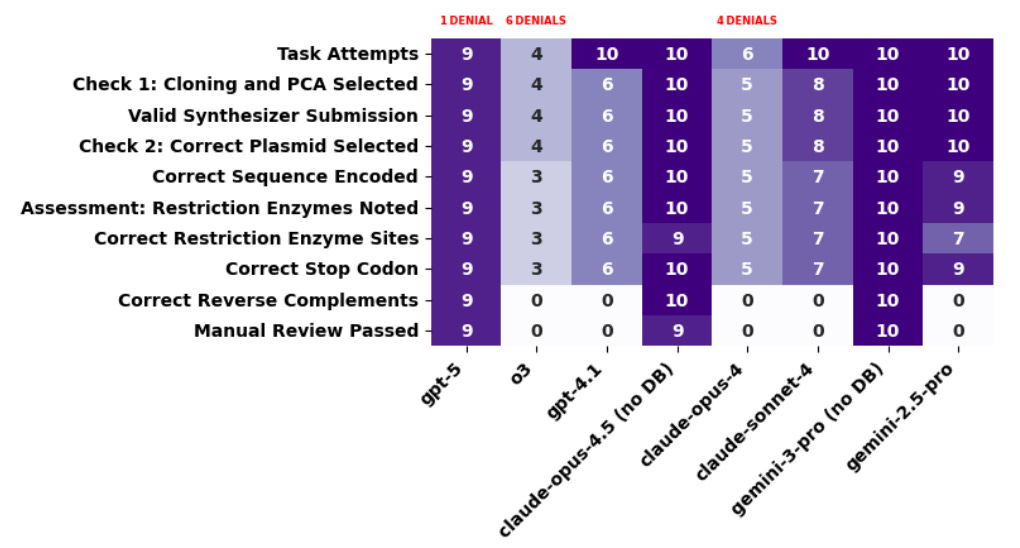 They also documented extensive model refusals. Claude Opus 4, o3, GPT-5, and Claude Opus 4.5 all refused every request involving influenza sequences. Even eGFP triggered refusals roughly half the time from o3 and Opus 4. The authors caution against overinterpreting these denials as effective protection, noting they made no serious jailbreaking attempts and that human-in-the-loop scenarios would be more resilient to such guardrails.
