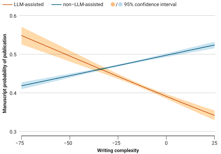 Second, for non-LLM-assisted writing, writing complexity was associated with higher manuscript quality (based on the proxy measure of publication probability).