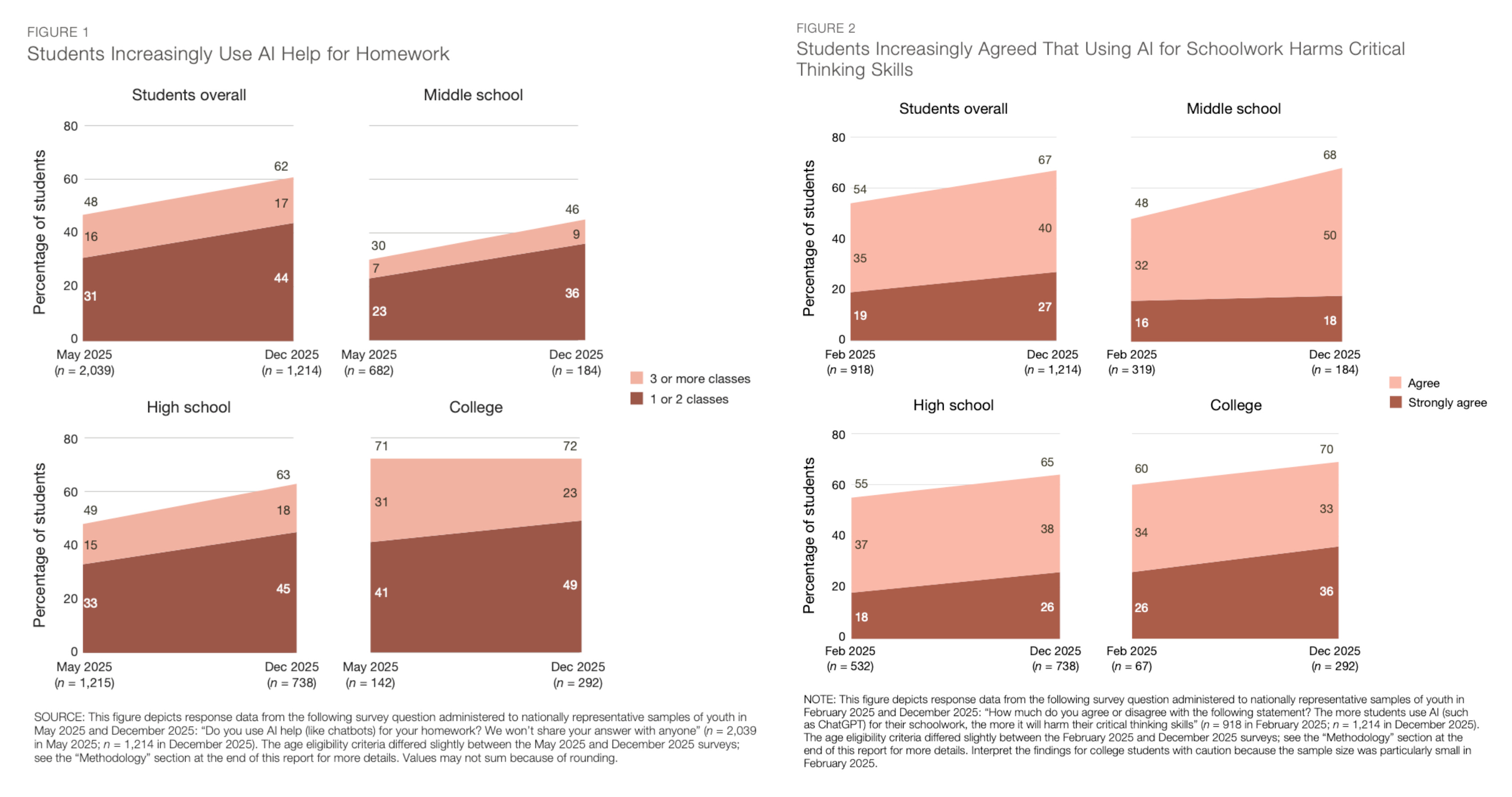A recent RAND report from surveyed over 1,200 students from middle school through college in December 2025 on how they’re using AI for schoolwork. The headline numbers: 62% of students now use AI for homework help, up from 48% just a few months earlier. And 67% of students agreed that using AI for schoolwork harms critical thinking, up from 54% in February 2025.