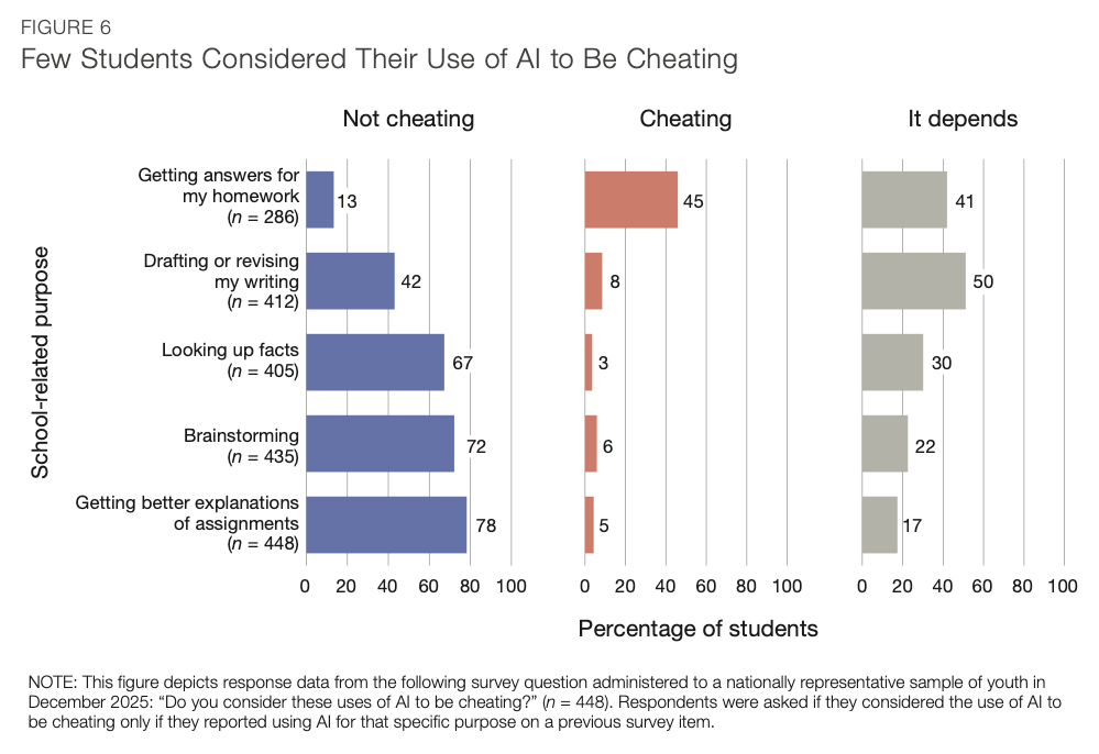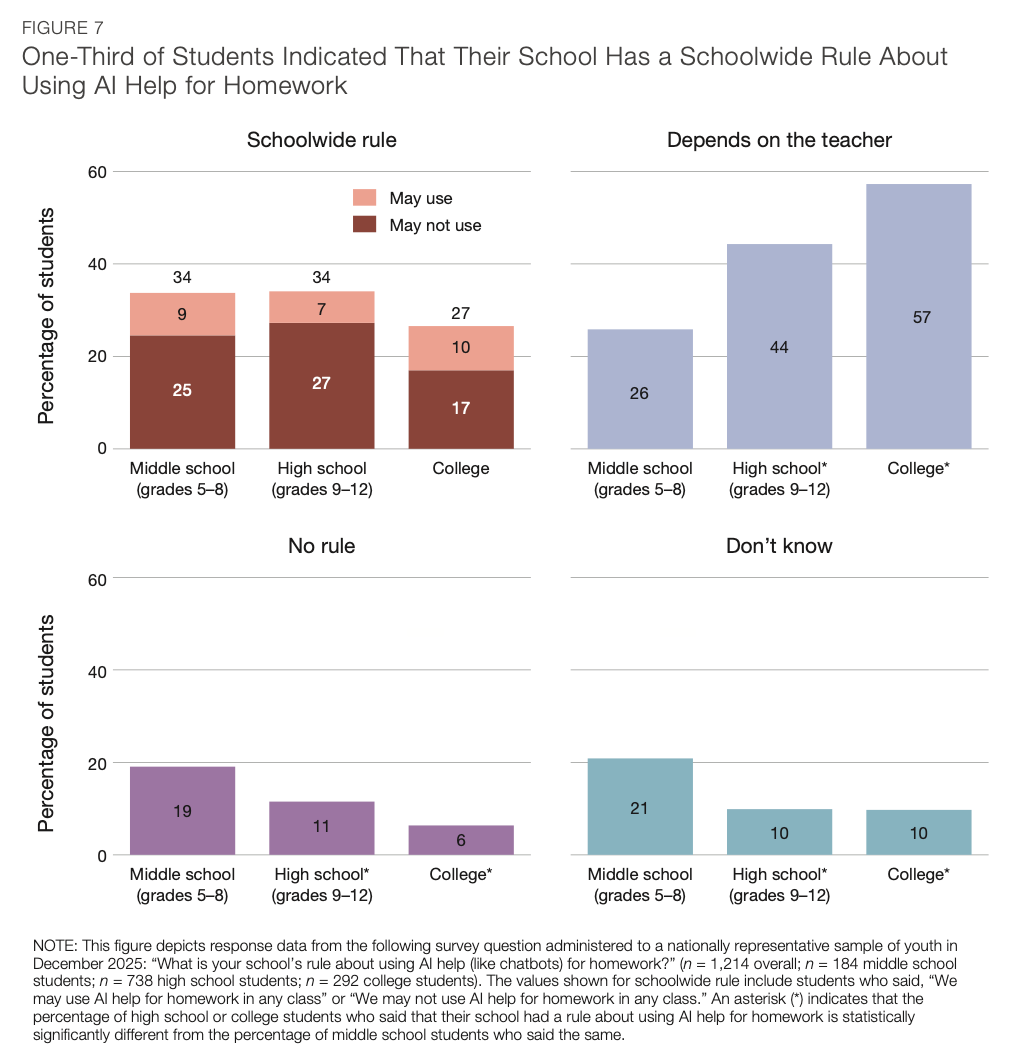 Only about a third of students said their school had any schoolwide rule about AI use. Middle schoolers reported the least clarity, which is concerning given that middle school is where AI use grew fastest over 2025.