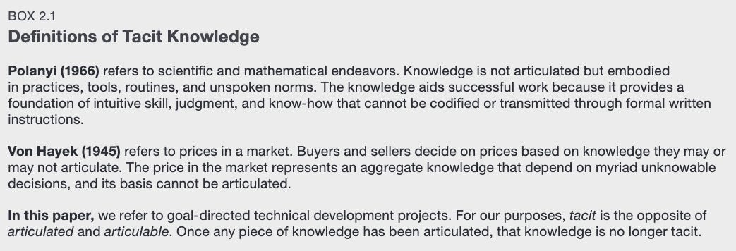 That is, knowledge relevant to a goal-directed technical development project that can’t be easily articulated. In other words, once you can express tacit knowledge in words, it’s no longer tacit.