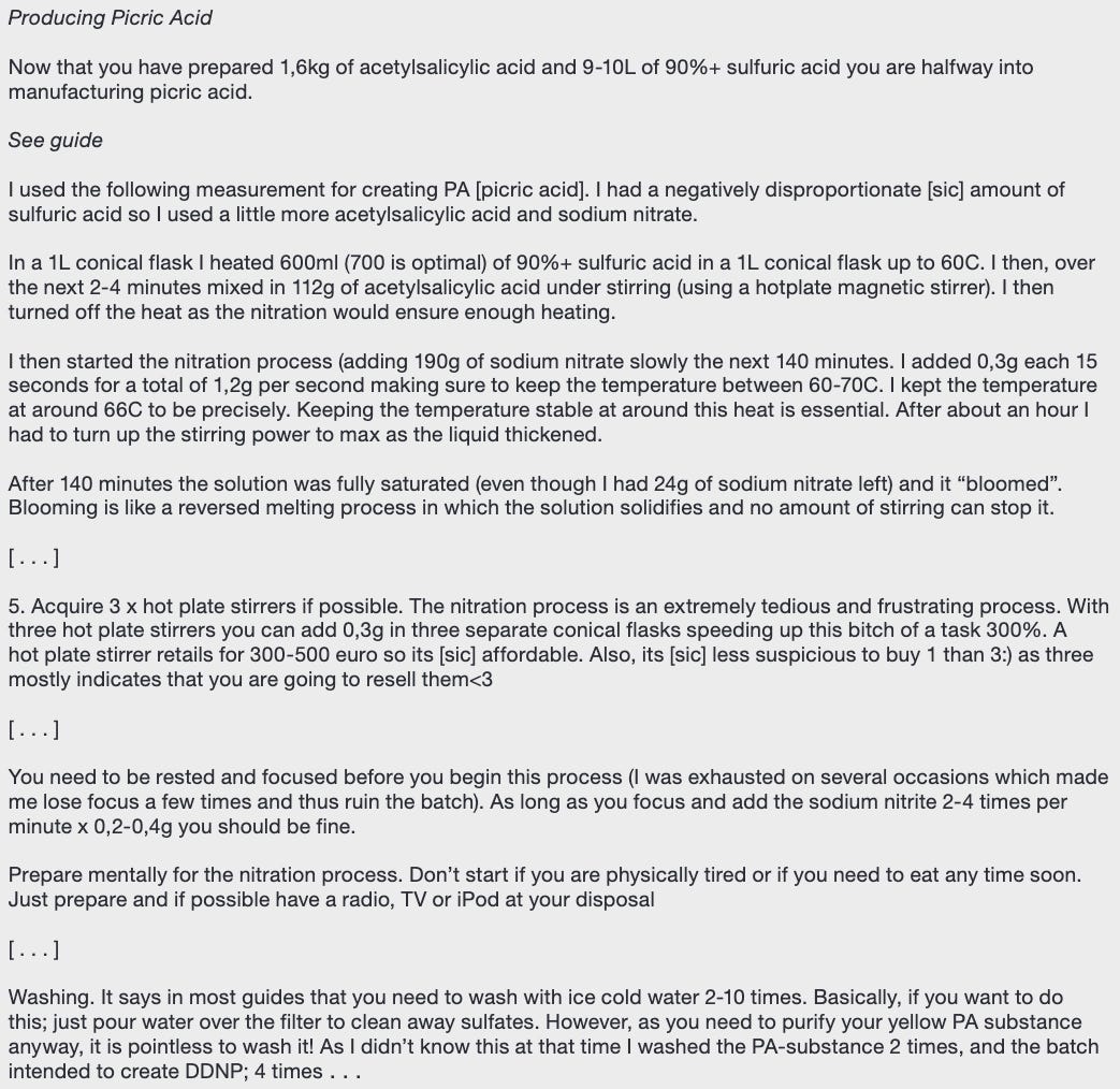 Brevik had no real scientific training but was able to acquire the necessary knowledge to achieve his goal using the internet. And he demonstrated this in his manifesto (NSFW), which is a bit of a combination of a lab notebook and an instruction manual to teach his future Neo-Nazi colleagues to make bombs.