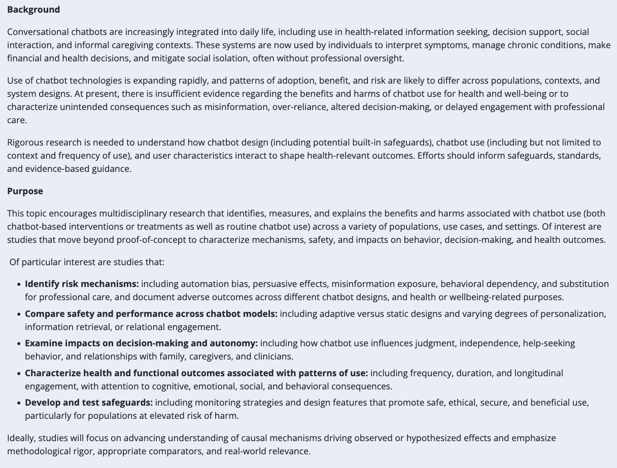 NIH Highlighted Topic: Research on Chatbots and their Usage. NIH posted a new Highlighted Topic (not a NOFO, but a signal of where institutes want to see investigator-initiated applications) on the benefits and harms of chatbot use in health contexts. The scope is broad: automation bias, behavioral dependency, substitution for professional care, effects on decision-making and autonomy, and safeguards for at-risk populations. Lots of participating ICOs. If you’re doing any research on LLM-based tools and health outcomes, this is NIH telling you there’s a welcome mat out. Apply through a PA; topic expires April 2027.