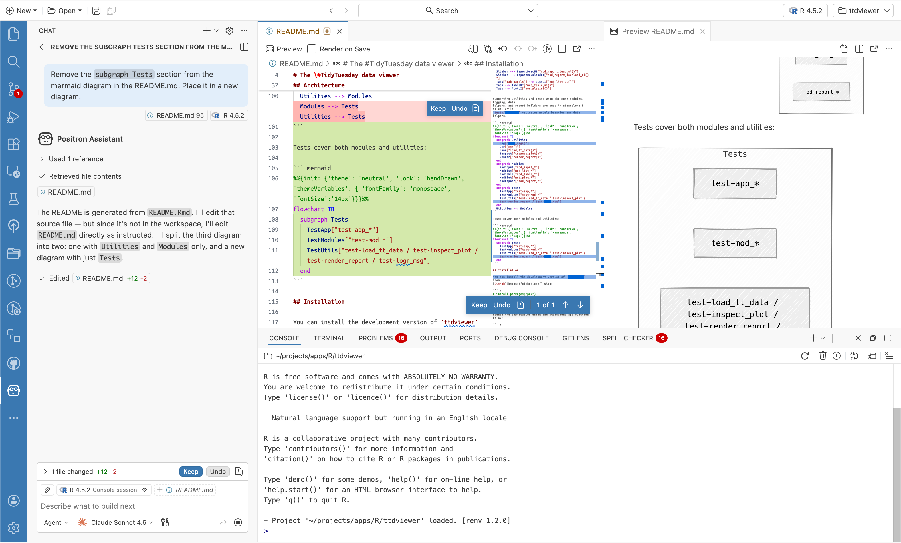 Comparing Posit Assistant and Claude Code: How does Posit Assistant differ from Claude Code? Sara Altman and Simon Couch demonstrate three ways Posit Assistant differs from Claude Code for data tasks: built-in R session access, easier data visualization workflow, and support for iterative data analysis.