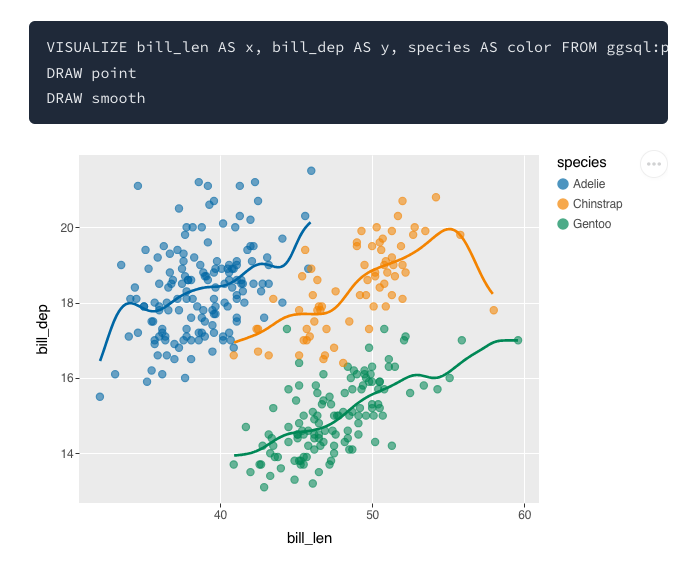ggsql: A grammar of graphics for SQL. Posit's alpha release of a SQL extension that adds VISUALIZE, DRAW, PLACE, SCALE, and LABEL clauses to build ggplot-style layered graphics directly from a query result, with a DuckDB backend and support in Quarto, Jupyter, Positron, and VS Code. The stated motivations include meeting analysts who live in SQL on their own ground and the observation that LLMs write SQL fluently, which makes the declarative grammar a natural interface for code-assistant-driven visualization.