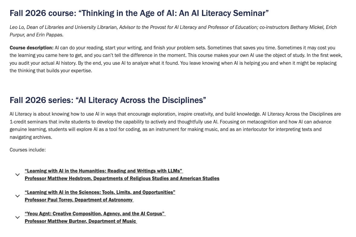 AI Literacy and Action Lab. UVA Library and the College of Arts & Sciences launched a joint program this year that pairs librarians with faculty as instructional partners across five spring/summer pilots, including Anton Korinek's economics course on AI and the future of work (with hands-on sessions using Claude Code, Google Antigravity, and Codex), Piers Gelly's first-year writing course partnering with a local high school, and early-stage plans with David Danks in the School of Data Science and Andreas Gahlmann in Chemistry. The Lab treats each pilot as a publishable case study with pre/post assessment data, aimed at contributing to a national evidence base for AI literacy in higher education.