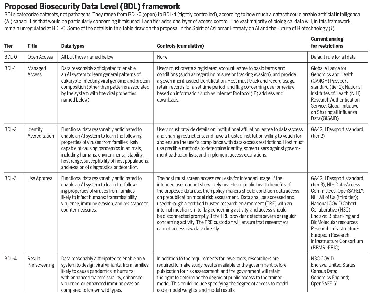 Science: Biological data governance in an age of AI. This policy forum paper proposes “Biosecurity Data Levels” (BDL-0 to BDL-4) for controlling access to pathogen data used to train bio AI models. Most bio data stays open (BDL-0); only narrow, high-risk functional virology data would require trusted research environments and pre-release safety screening. Earlier this week I published a post about this and an NTI|bio paper that was published around the same time, both touching on similar topics.