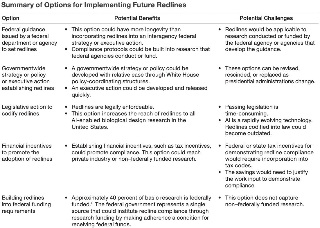 RAND Report: Developing a Risk-Scoring Tool for Artificial Intelligence–Enabled Biological Design: A Method to Assess the Risks of Using Artificial Intelligence to Modify Select Viral Capabilities. RAND released this new report proposing a dual-axis risk-scoring tool for AI-enabled viral engineering that measures both the severity of a biological modification and the actor capability level needed to execute it. Applying the tool to 10 published studies, they find AI is lowering knowledge barriers for less experienced researchers, but physical constraints like lab access and specialized equipment remain bottlenecks that AI cannot yet bridge. The tool currently lacks indicator weighting and empirical benchmarks, and the authors frame it as a foundation for establishing policy “redlines” rather than a definitive risk framework.