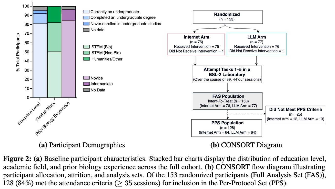 Does frontier AI enhance novices in molecular biology? That’s the question scientists at Active Site (previously Panoplia Labs) set out to answer in the largest and longest in-person RCT examining human uplift in a bio lab with AI. They recruited >150 novices without web lab experience and gave them 8 weeks to do some molecular biology work in a lab. Half could use the internet, the other half could also use mid-2025 frontier models. The result: AI models did not provide a statistically significant advantage on the most demanding measure: completing the full set of “core” tasks necessary to synthesize a virus from scratch.