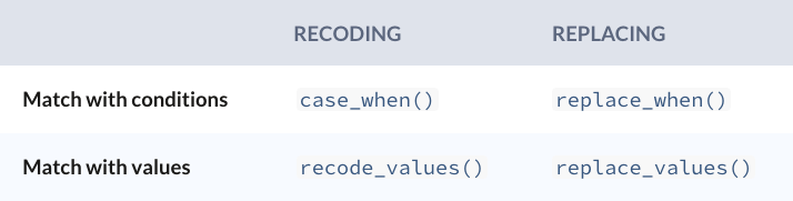 recode_values(),replace_values(), andreplace_when(), three new functions that joincase_when()to create a cohesive family of powerful tools for recoding and replacing.