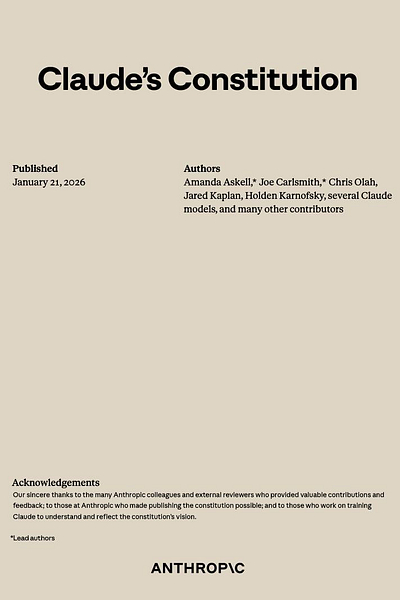 This week Anthropic released the Claude Constitution, a detailed description of their vision for Claude’s behavior and values, used directly in their training process. The full constitution document is available at anthropic.com/constitution. It’s 84 pages, released as CC0 (public domain). PDF below. Claude’s constitution came out yesterday. It’s long, 84 pages printed. Lawfare’s legal analysis is interesting. ...And interestingly, Simon Willison points out that two of the contributors are Catholic members of the clergy - Father Brendan McGuire is a pastor in Los Altos with a MS in CS and math, and Bishop Paul Tighe is an Irish Catholic bishop with a background in moral theology.