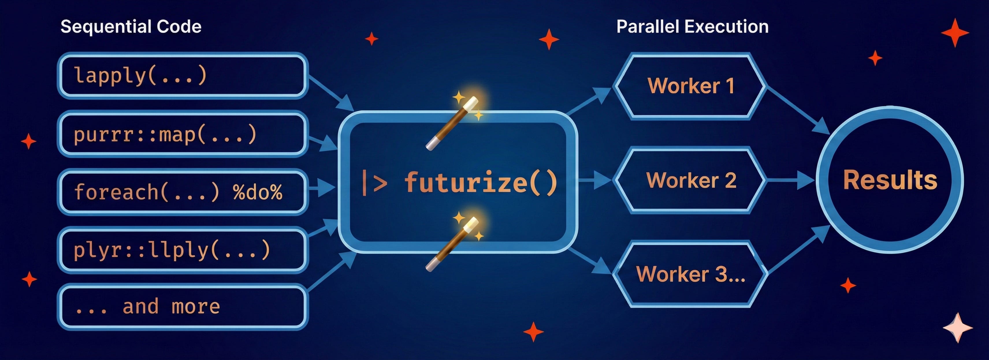futurize: Parallelize Common Functions. The futurize package is the latest addition to the Futureverse project. It lets you simply add futurize() to any number of vectorized functions and it’ll handle transpiling that to whatever framework is needed to parallelize the action (whether that’s furrr, future, BiocParallel, etc. E.g.: