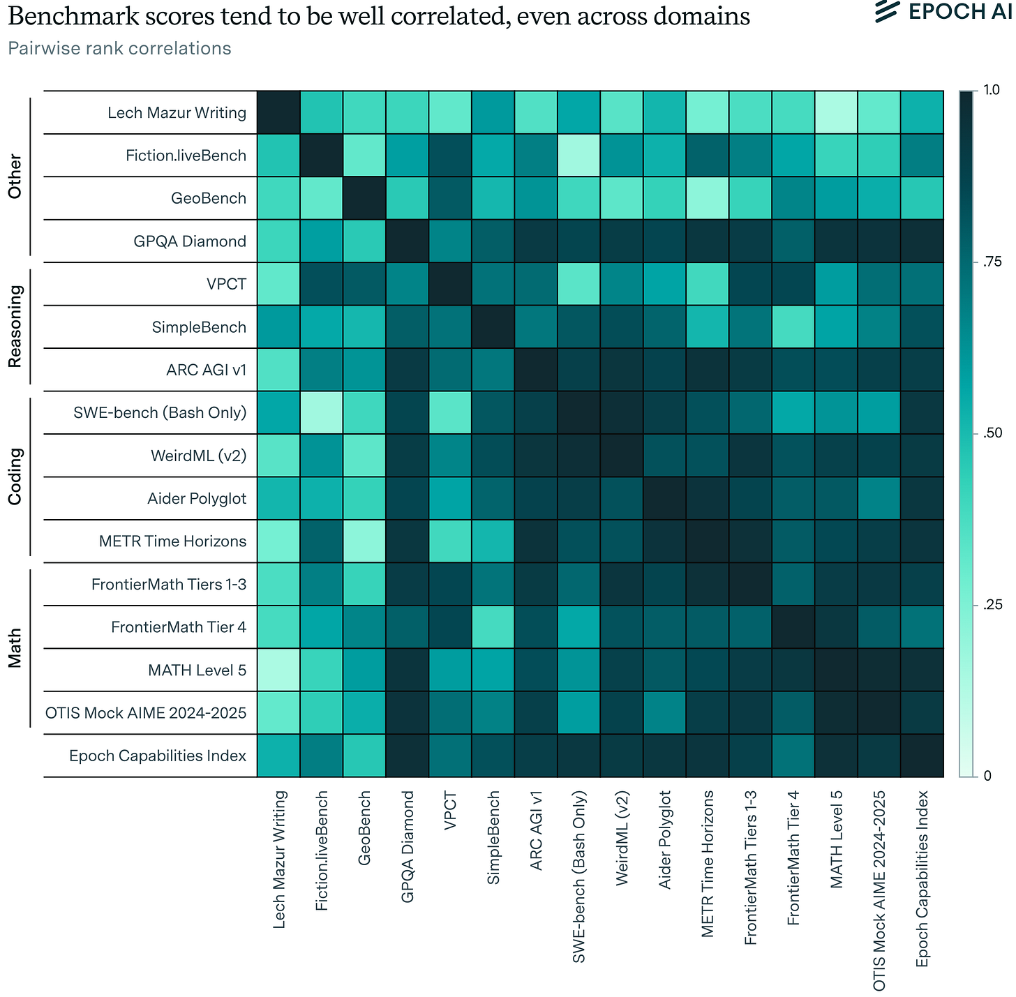Luke Emberson at Epoch AI: Benchmark scores are well correlated, even across domains.
