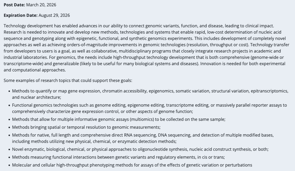 Technology Development for Genomics. A new NIH highlighted topic (open through August 2026) signaling investigator-initiated applications are welcome for new methods in sequencing, epigenomics, functional genomics, multiomics, spatial/temporal resolution, direct RNA/DNA sequencing, oligo synthesis, and high-throughput phenotyping of genetic perturbations. Participating ICOs include NHGRI, NIAID, NCI, NHLBI, and others. Not a specific funding opportunity announcement, but a signal of what program officers want to see come through the parent R01/R21 mechanisms. Particularly relevant context given the OMB hold on NIH spending just lifted this week; if new grants are about to start flowing again, knowing what the institutes are hungry for matters.