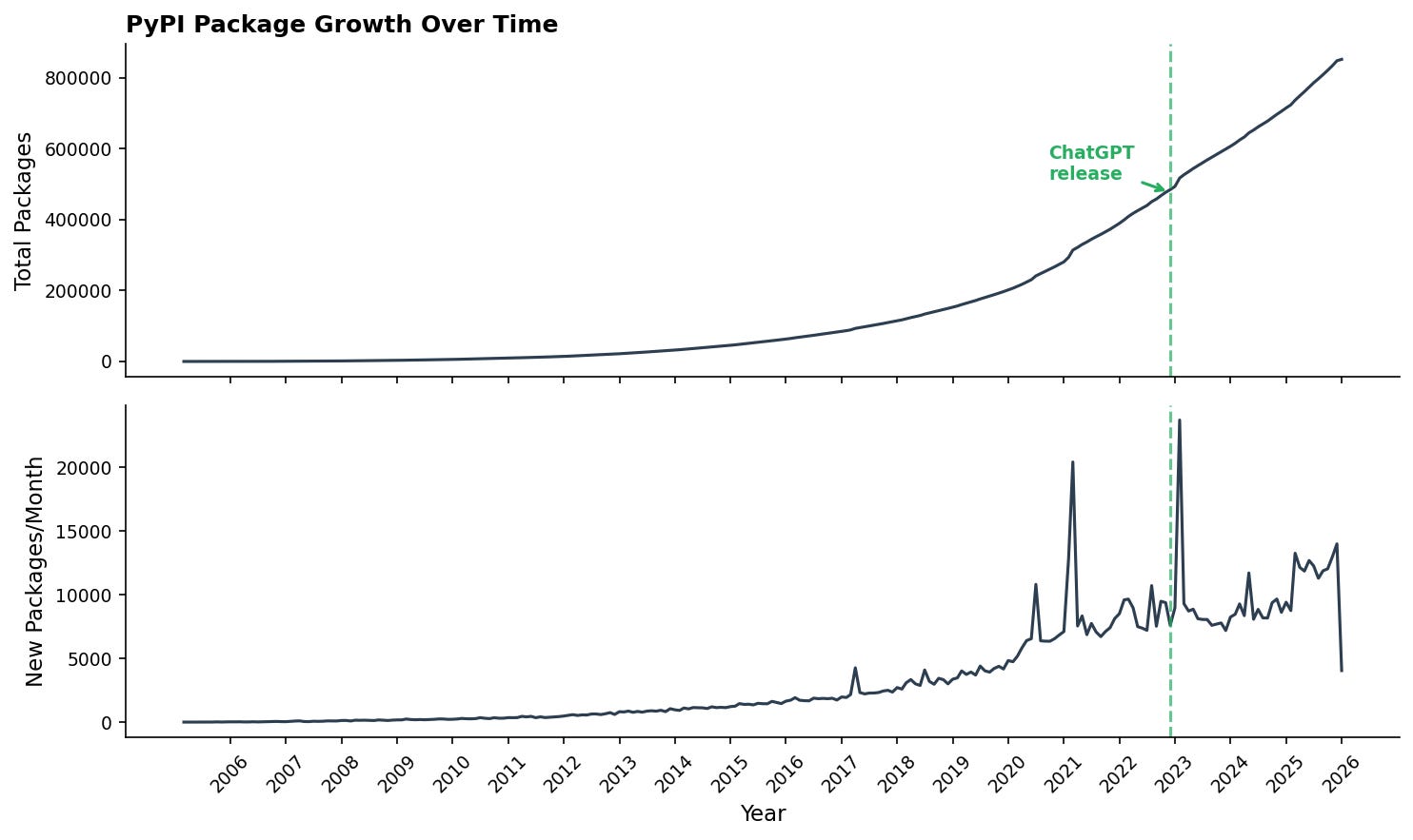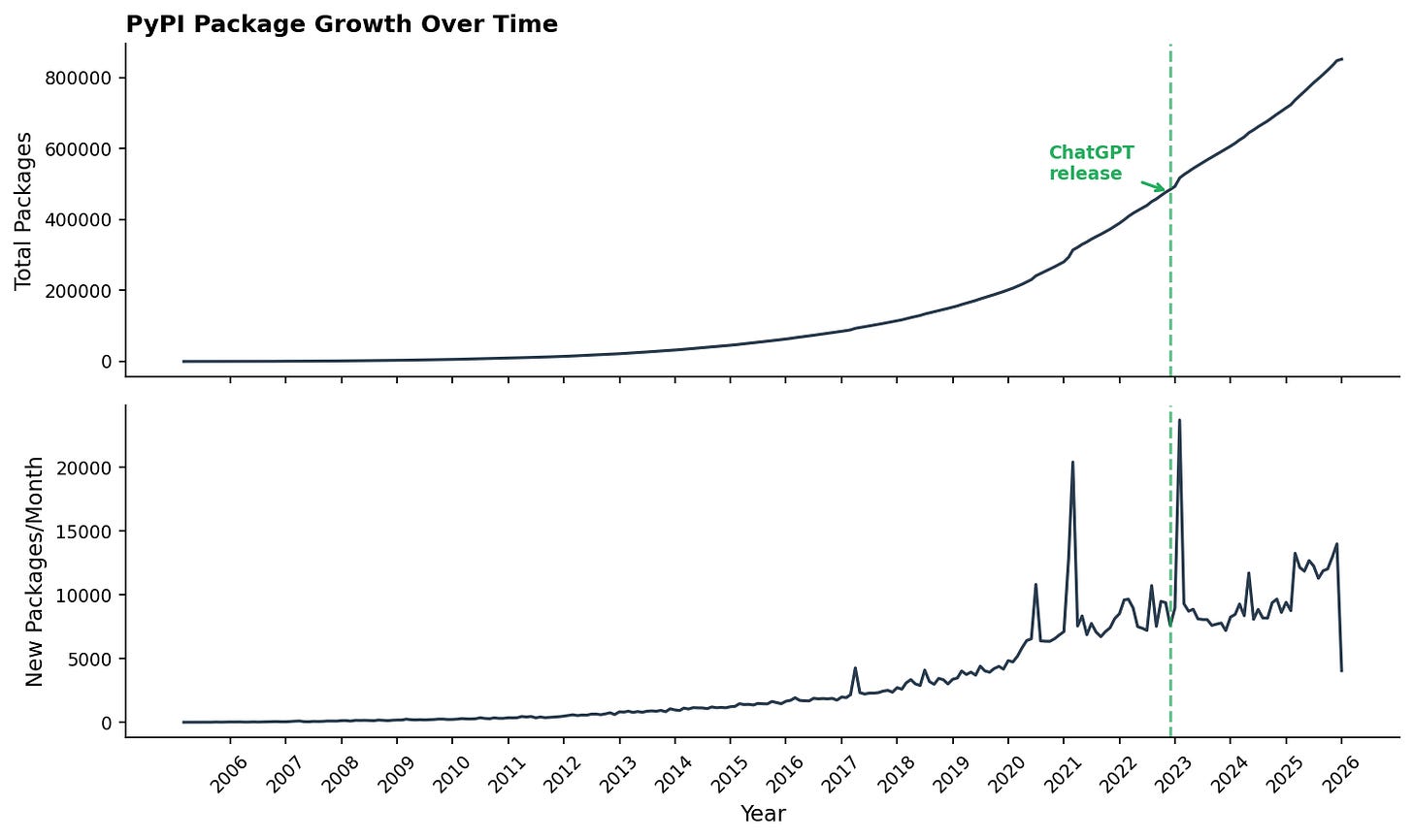 Alexis Gallagher and Rens Dimmendaal: So Where Are All the AI Apps?. If AI coding tools make developers 2x (or 10x, or 100x) more productive, you should be able to see it in PyPI package creation and update rates. The authors looked, and mostly didn’t see it. Total package creation shows no inflection at ChatGPT’s release. Update frequency for the top 15,000 packages shows a modest secular trend that predates AI tools. The one place a clear >2x effect does appear: popular packages about AI, which jumped post-ChatGPT compared to popular non-AI packages. The authors’ two candidate explanations are that AI-tool builders are the ones most skilled at using AI to build (a skill effect), or that the flood of money into AI is simply paying for more work on AI packages (a funding effect). Probably both, but the data can’t distinguish them. Either way, the Cambrian explosion in all software hasn’t materialized; the measurable effect is concentrated in the AI ecosystem building tools for itself.