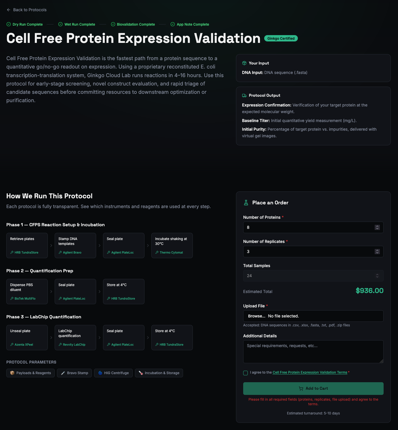Ginkgo Bioworks launches Cloud Lab: https://cloud.ginkgo.bio/. Protocols that run in a fully autonomous lab. Currently 3 protocols are available, more on the way.
