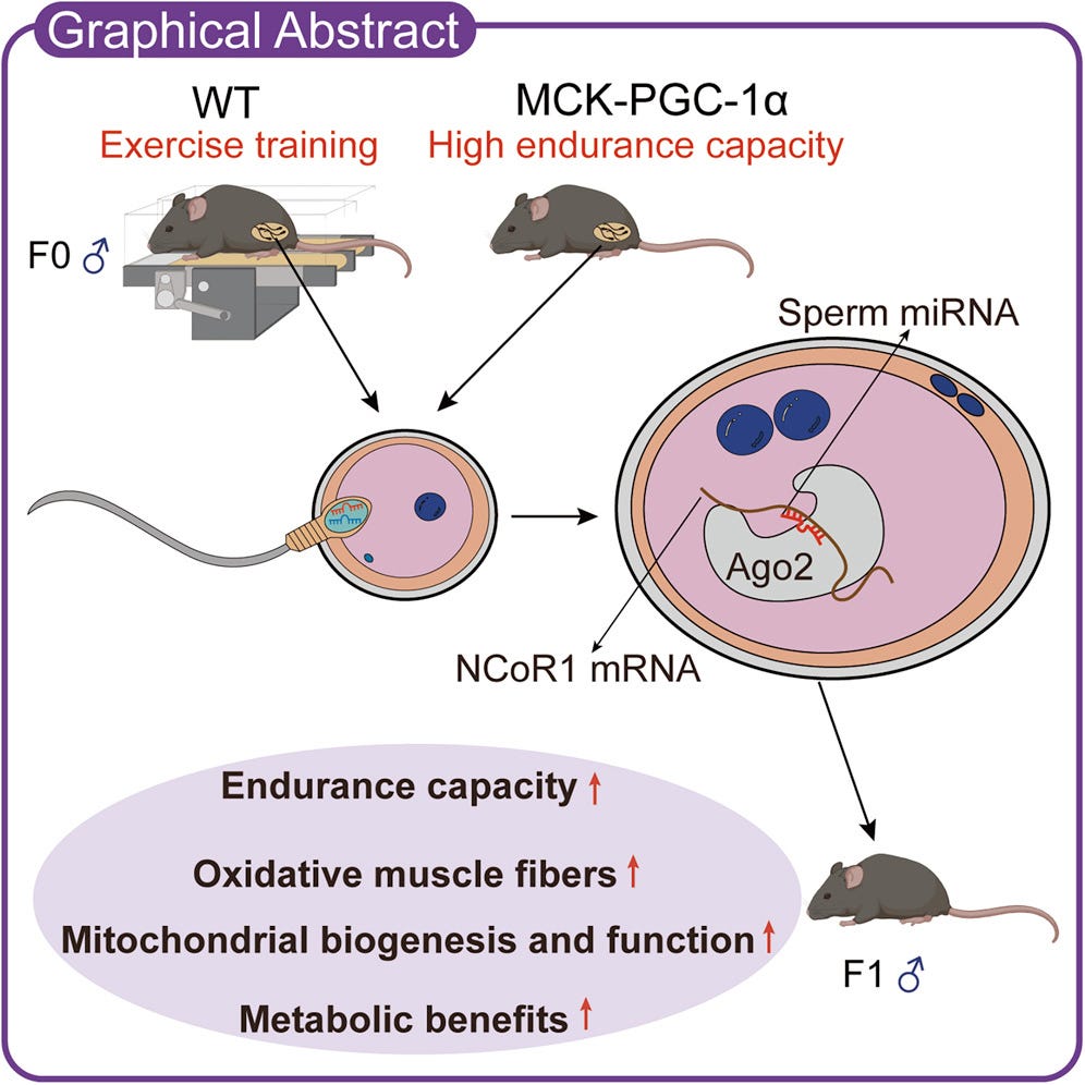 A super interesting paper in Cell Metabolism: Paternal exercise confers endurance capacity to offspring through sperm microRNAs. From the abstract: “offspring sired by exercise-trained fathers display intrinsic exercise adaptations and improved metabolic parameters compared with those sired by sedentary fathers.”