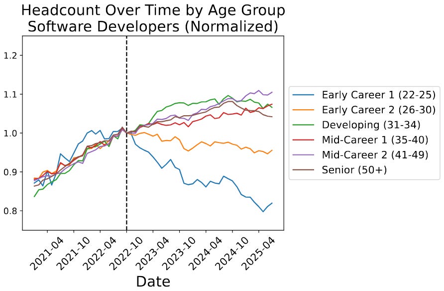 Stanford Digital Economy Lab / Stanford Institute for Human-Centered AI: Canaries in the Coal Mine? Six Facts about the Recent Employment Effects of Artificial Intelligence. See also the IEEE Spectrum coverage of this paper: How Badly Is AI Cutting Early-Career Employment? U.S. software engineers, among others, are feeling the effects. A particularly concerning figure from the paper: