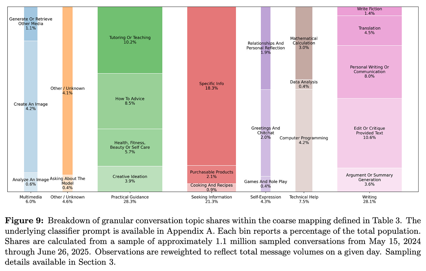 NBER paper from OpenAI: How People Use ChatGPT (pdf). OpenAI examines >1 million chats and provides detailed breakdown on how people are using ChatGPT. Practical guidance (tutoring, how-to, what to do about this weird rash) and writing (editing, critiquing, doing your English homework) dominate.