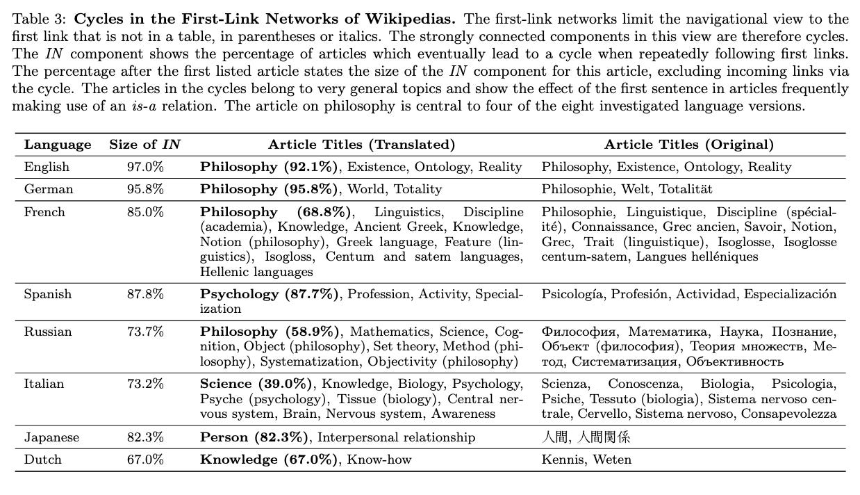 Over the weekend I stumbled across an interesting conference paper: Evaluating and Improving Navigability of Wikipedia. The article shows if you follow the first link in the main text of an English Wikipedia article, and then repeat the process for subsequent articles, it’ll lead you to Philosophy 97% of the time.