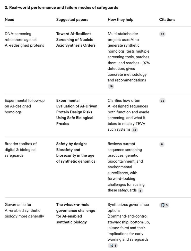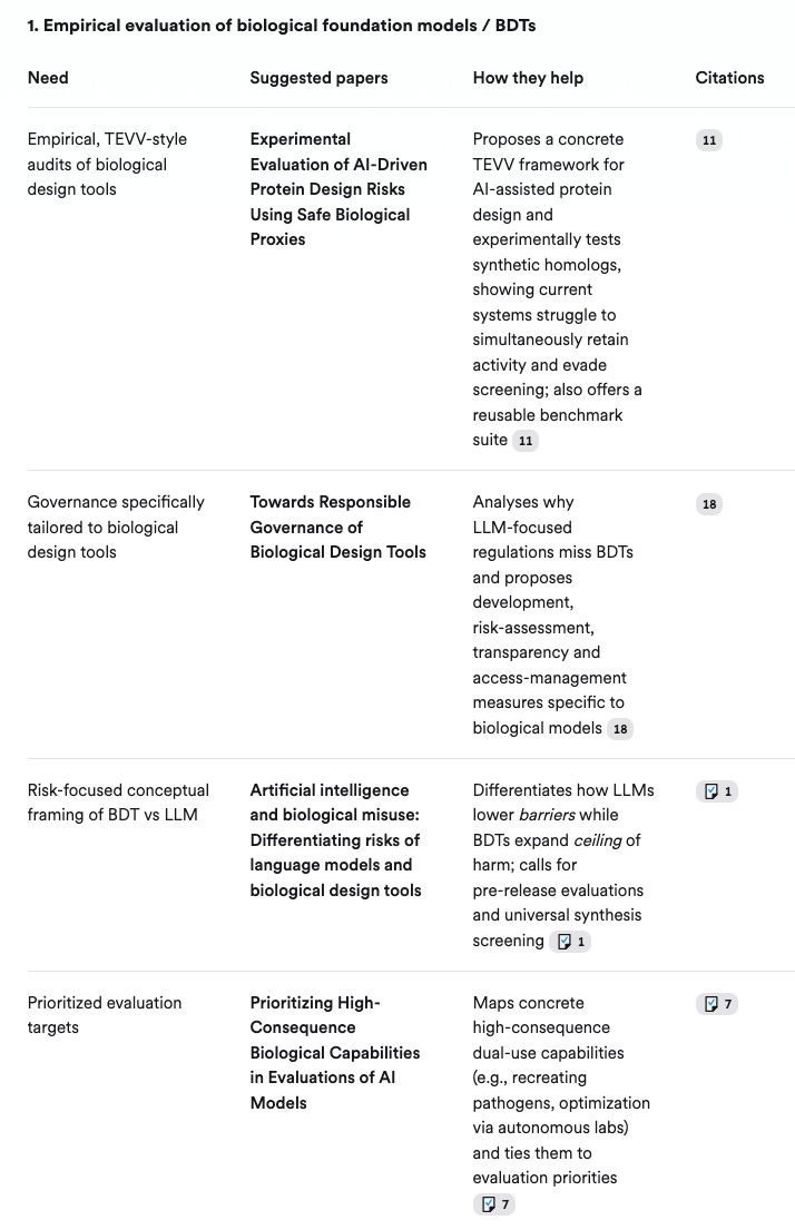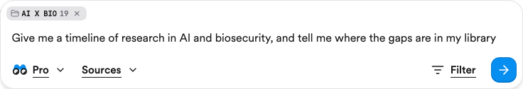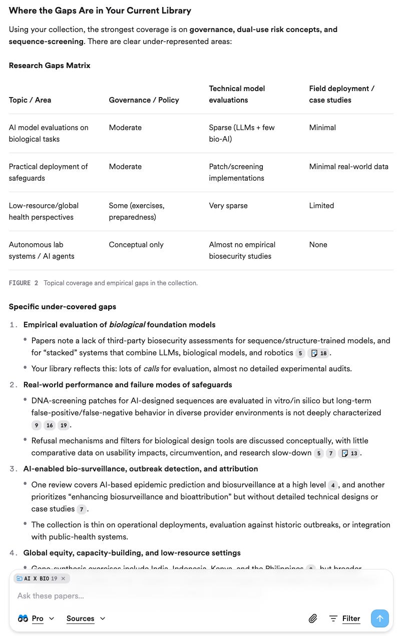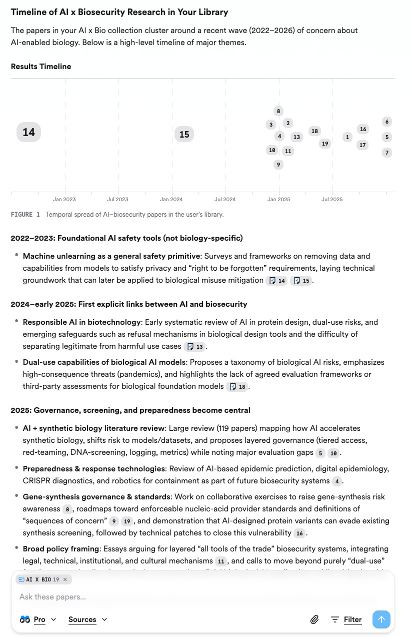 I gave it a small collection of papers in AIxBio (as noted further below, preprints aren’t supported yet, those are coming next month). I asked it for a timeline, and gaps in my library.