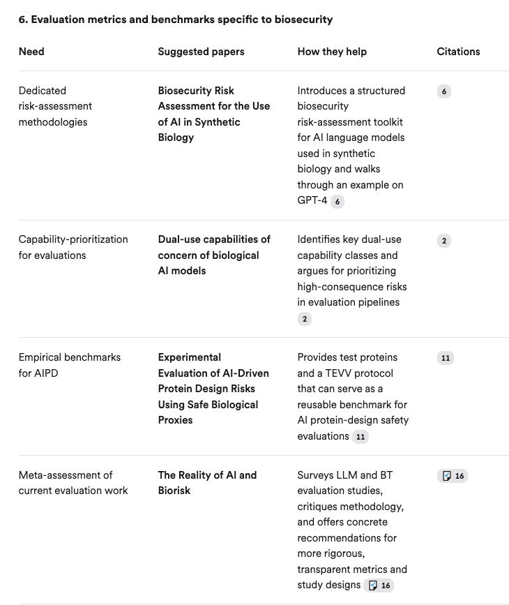 Gap: Evaluation metrics and benchmarks specific to biosecurity